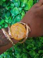 Heavy hammered metal mixed with beautiful yellow and orange confeti rhinestone statement bracelet.