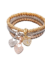 When you can't decide if you want, gold, silver or rose gold, these shimmering bracelets with rhinestone heart charms are just perfect.