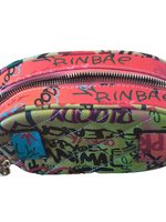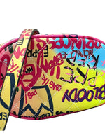 This stylish vegan leather bag features a trendy graffiti and quilted design and can be worn as a crossbody or waist bag.