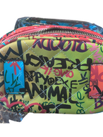 This stylish vegan leather bag features a trendy graffiti and quilted design and can be worn as a crossbody or waist bag.  Product Details: Type: Fannypack/Waist bagComposition: Faux leather, metalColor: Multicolor (yellow/lime green)Strap Type: Chain, adjustable...