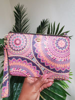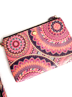 This beautiful piece doubles as a mini clutch/wristlet or makeup bag, featuring a delicate design of geometric patterns reminiscent of Morocco.