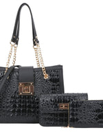 Your new reason to like animal print! The Rapsody Trio is an amazing three piece set is made with a quality, faux leather embossed croc print features a hand bag, wallet and crossbody bag. Literally, the best of all worlds in a set.