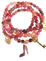 Cinnamon Charm is a 4-piece custom designed beaded bracelet set made of pink and purple faceted Dragon's Vein stones, with gold accent findings, a cutesy shoe, pave rhinestone locket heart, key, and inspirational charm.