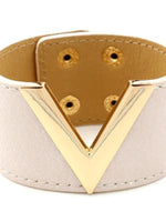 Details: Faux leather, gold metal accents, snap closure, cuff style, v-shaped