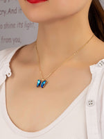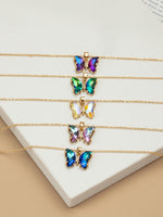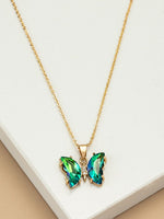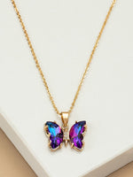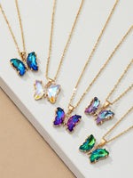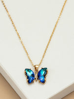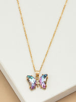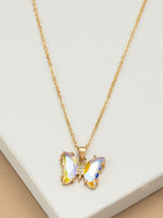 Aurora Borealis finish crystal butterfly pendant necklace. Made of glass, brass and iron.