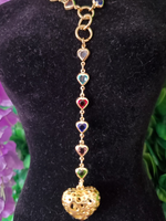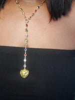 Rainbow Hearts is a (14") necklace featuring rainbow colored, heart-shaped glass pendants, and has a center drop piece with filigree open puff pendant.  Fasteners are gold plated gold-plated.  Looks great solo or layered with other pieces.
