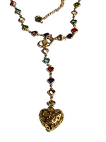 Rainbow Hearts is a (14") necklace featuring rainbow colored, heart-shaped glass pendants, and has a center drop piece with filigree open puff pendant.  Fasteners are gold plated gold-plated.  Looks great solo or layered with other...