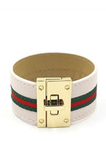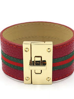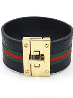 Stylish faux leather, striped bracelet, bucklet lock Color:  Black/RedMaterial: Faux leather, gold metal accentsDetails: Designer inspired, accent stripes, twist lock closureStyle: FashionSize: 7.8L x 1.2WShips:  5 days