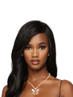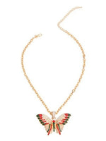 This rhinestone adorned butterfly necklace is the perfect statement piece in its red and green designer inspired color theme. It's oval link style chain measures 18" long, with the pendant measuring at 1.65 inches.