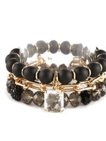 Add a touch of style and design to any outfit with this stack of beaded stretch bracelets. Stack of four (4) Product Details: Material: Wood, metal  Color: Black, gold accentsShips: 2-3 day shipping