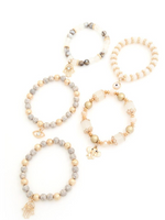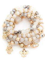 Product Details: Color: Gray, naturalMaterial: Glass, plastic and metal beads, stack of five (5)Details:  Hamsa, elephant and eye charmsShips: 5 day via USPS