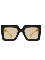 ✨Product Description: Retro soul. Modern glow.The Golden Hour Link Sunnies turn heads with their oversized square frames, light yellow-orange tinted lenses, and luxe gold-link arm detailing. With a bold black frame and a soft retro...