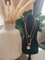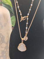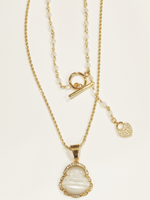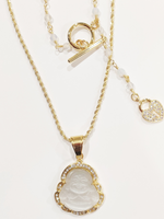 The Alaina two-piece necklace set combined an intricately designed genuine opal gemstone wrapped in 18k e-plated gold with a rhinestone heart charm and and a clear laughing Buddha pendant on a dainty rope chain.