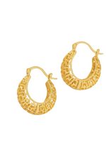 Details: Greek key, ultra lightweight filigree hoop earrings, 2" x 2", lever back, gold-plated