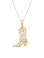 Saddle up in style with the Dallas Cowboy Boot Necklace, a rhinestone-studded stunner that blends country charm with golden glam. This eye-catching pendant features a cowboy boot silhouette encrusted with dazzling cubic zirconia, all suspended...