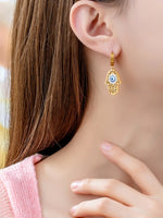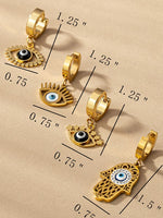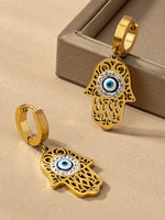 Protect your peace in elevated style with the Noor Earrings, a striking pair of gold-tone stainless steel huggie hoops designed for both beauty and durability. Featuring a laser-cut hamsa hand and a vibrant blue evil eye at the center, this drop design is framed by a circle of sparkling glass rhinestones in white enamel—symbolic and glamorous. Crafted with waterproof PVD plating, these earrings offer a long-lasting shine and resistance to wear far beyond traditional gold-plated jewelry.