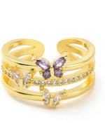 Details: 18k gold plated, 3-tier ring with pave stones, lilac butterfly accent, stainless steel