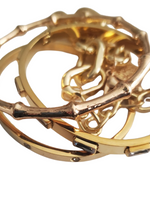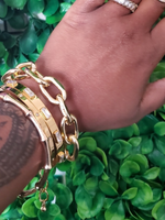The Gold Flair bangle set features a bamboo bangle, 2 crystal-accented bangles and a classic chain-link adjustable bracelet. Perfect combination together or worn individually.
