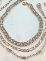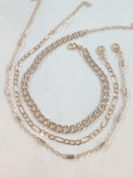 Product Details: Handmade anklets using 14k plated gold metal. (1)Figaro chain, (1) curb chain and (1) cylinder bead chain.