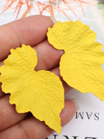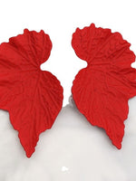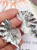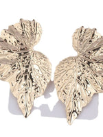 Sturdy metal leaf-shaped earrings that mirror each other.