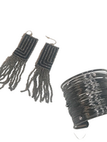 Elegant and classy, this matching set is perfect for the metal lover. Product Details: Earrings: Pewter metal, black and gray seed beads, 4" hook dangle earrings, lightweight. Bracelet: Pewter metal, multilayered cuff bracelet, adjustableStyle: Fashion Ships:...