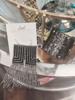 Earrings: Pewter metal, black and gray seed beads, 4" hook dangle earrings, lightweight.
